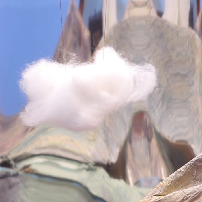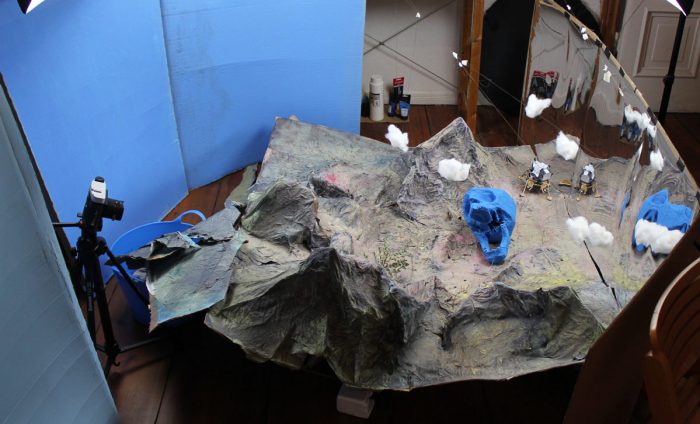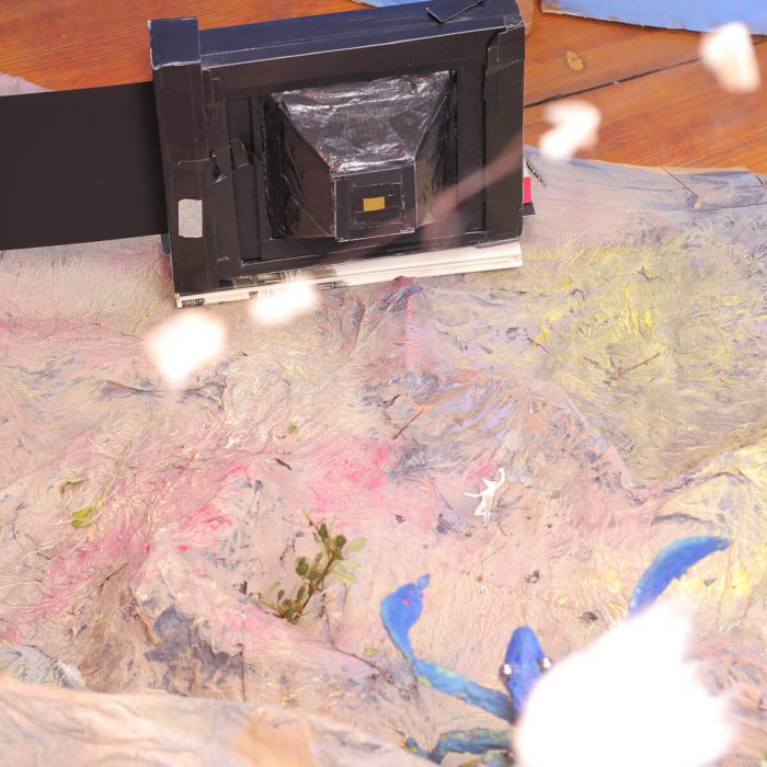 To create this illusion I decided to use painted cardboards, and on the opposite side of the stage, I have placed reflecting foil which has features of the mirror. The foil was easy to shape, so I could easily change the position and angle of it – to make sure that I am reflecting what I want to see in my pinhole camera viewfinder.